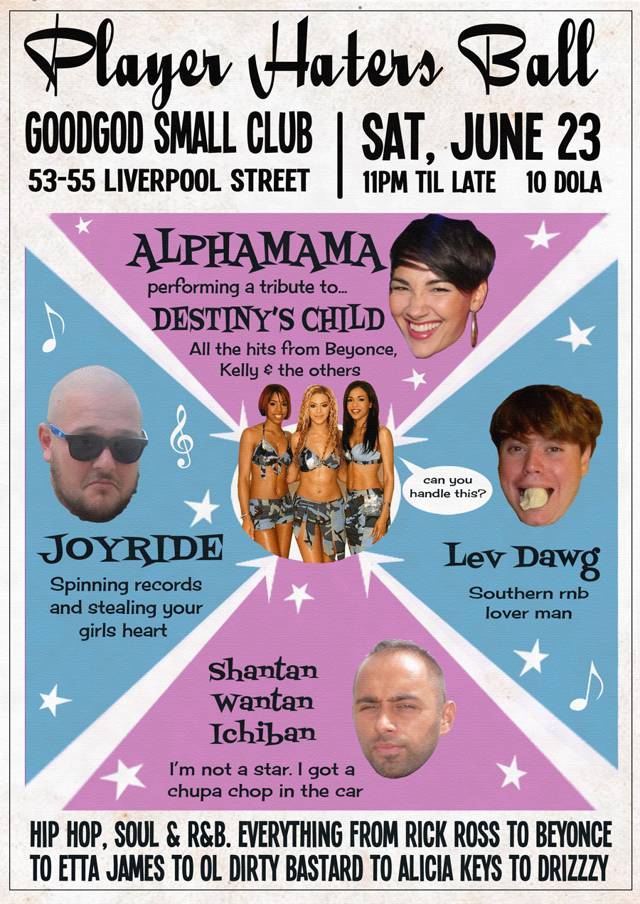 After packing out Goodgod with their R KELLY and NEPTUNES Tributes, the Player Hater’s Ball returns with a night playing hommage to the works of DESTINY’S CHILD.